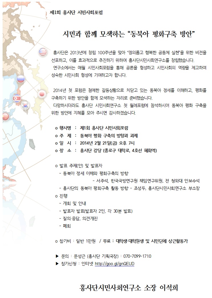 o 행사명 : 제1회 흥사단 시민사회포럼o 주 제 : 동북아 평화 구축의 방향과 과제o 일 시 : 2014년 2월 21일(금) 오후 7시o 장 소 : 흥사단 강당 (종로구 대학로, 4호선 혜화역) o 발표 주제(안) 및 발표자- 동북아 정세 이해와 평화구축의 방향 (최완규, 북한대학원대학교 총장)- 흥사단의 동북아 평화구축 활동 방향 (조성두, 흥사단시민사회연구소 부소장)o 진행- 개회 및 안내- 발표자 발표(발표자 2인, 각 30분 발표)- 질의·응답, 의견개진- 폐회 o 참가비 : 일반 1만원 / 무료 : 대학생·대학원생 및 시민단체 상근활동가